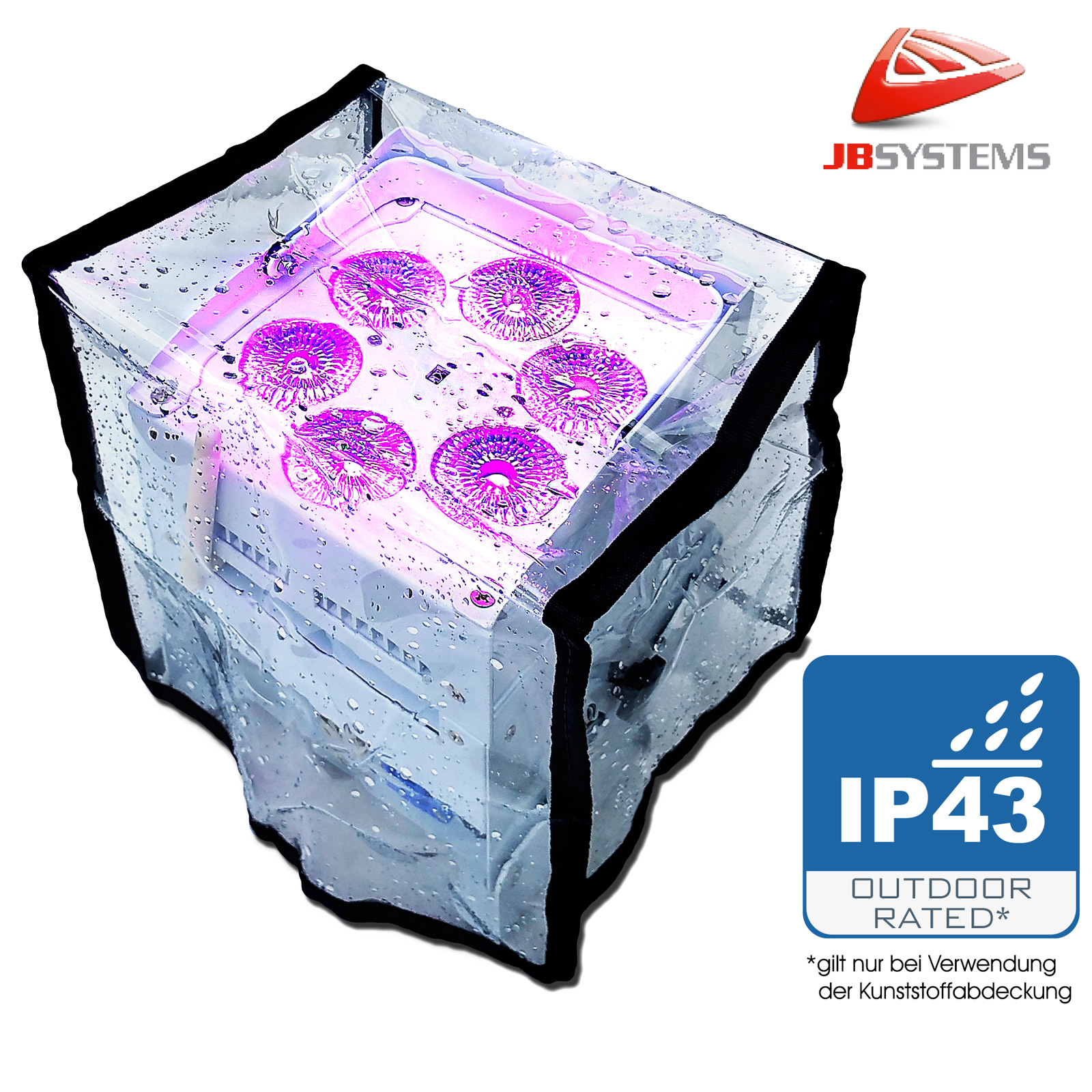 - Der Accu Color wird mit einer transparenten Kunststoffabdeckung zum Schutz gegen leichten Regen (IP43) geliefert. Deshalb kann er bedingt im Freien zum Beleuchten von Bäumen, Pflanzen, Gehwegen usw. verwendet werden.