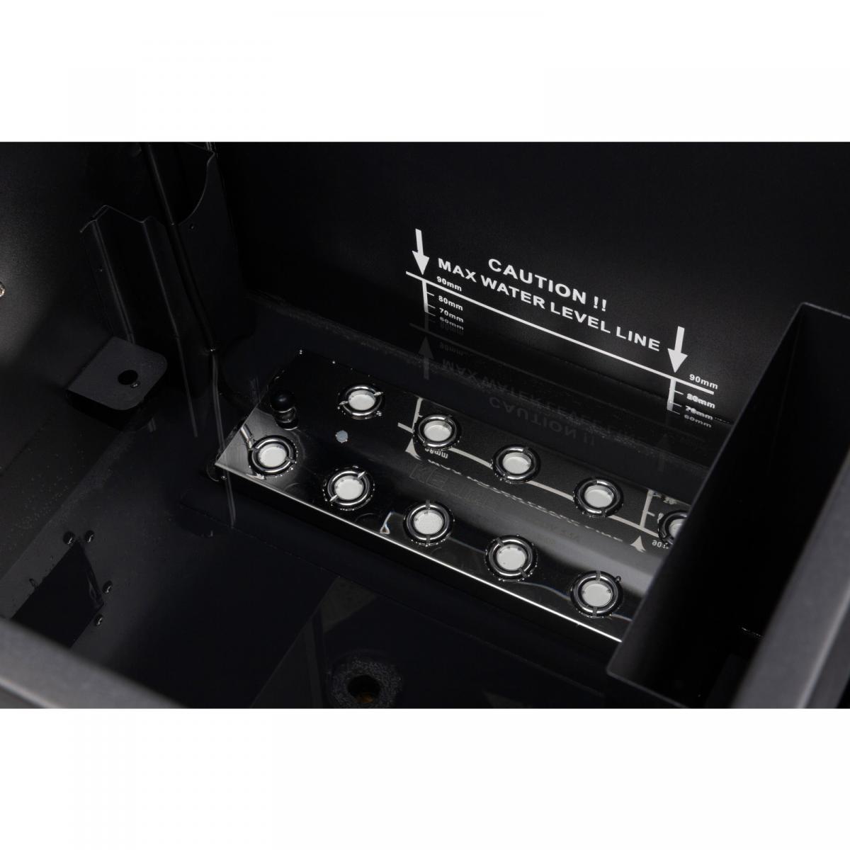 - Zwei leistungsstarke Ultraschallelemente wandeln die Kombination aus Nebelflüssigkeit und destilliertem Wasser in eine große Menge Bodennebel um