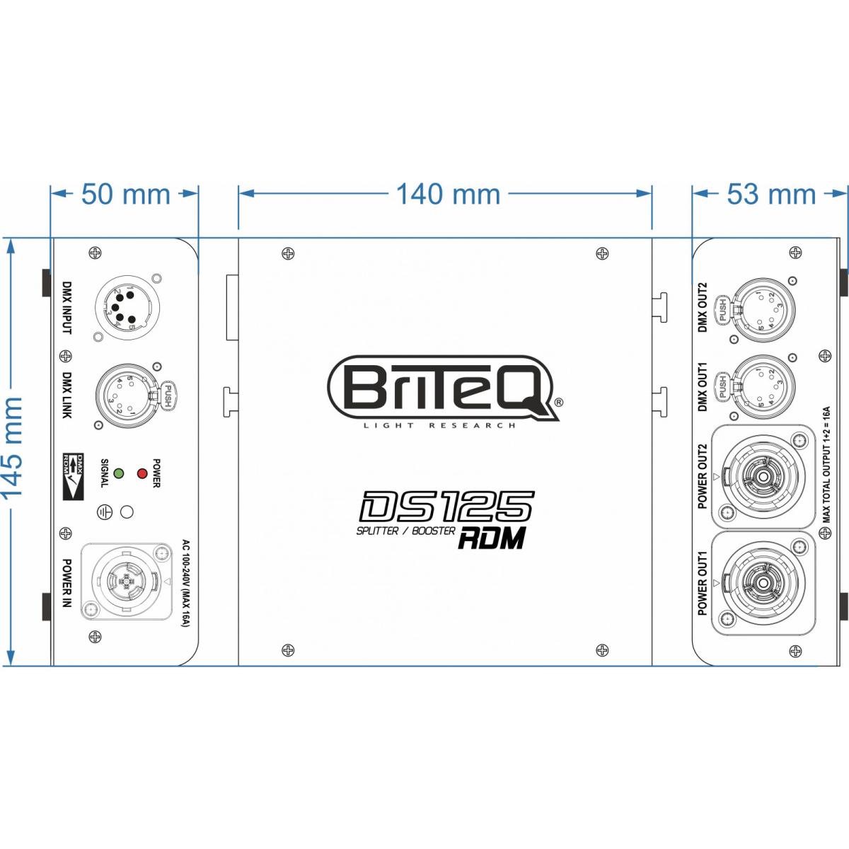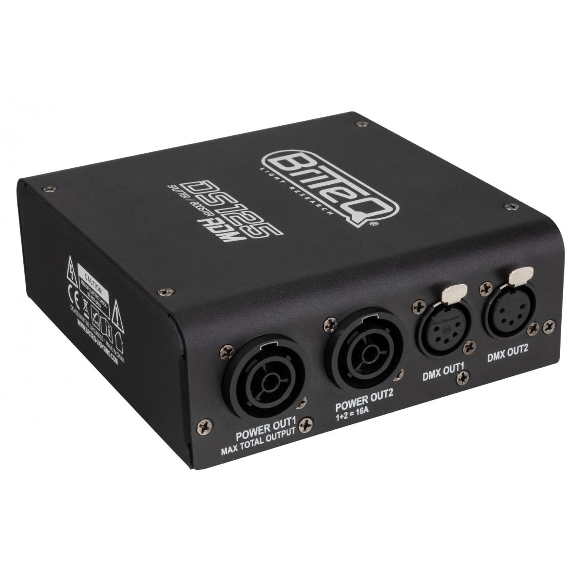 Der DS125-RDM von Briteq ist ein sehr kompakter und robuster RDM-kompatibler DMX-Splitter. Der Splitter verteilt den Netzstrom (PowerCON TRU1) und den DMX-Eingang (5pin-XLR) auf 2 optisch getrennte Ausgänge.