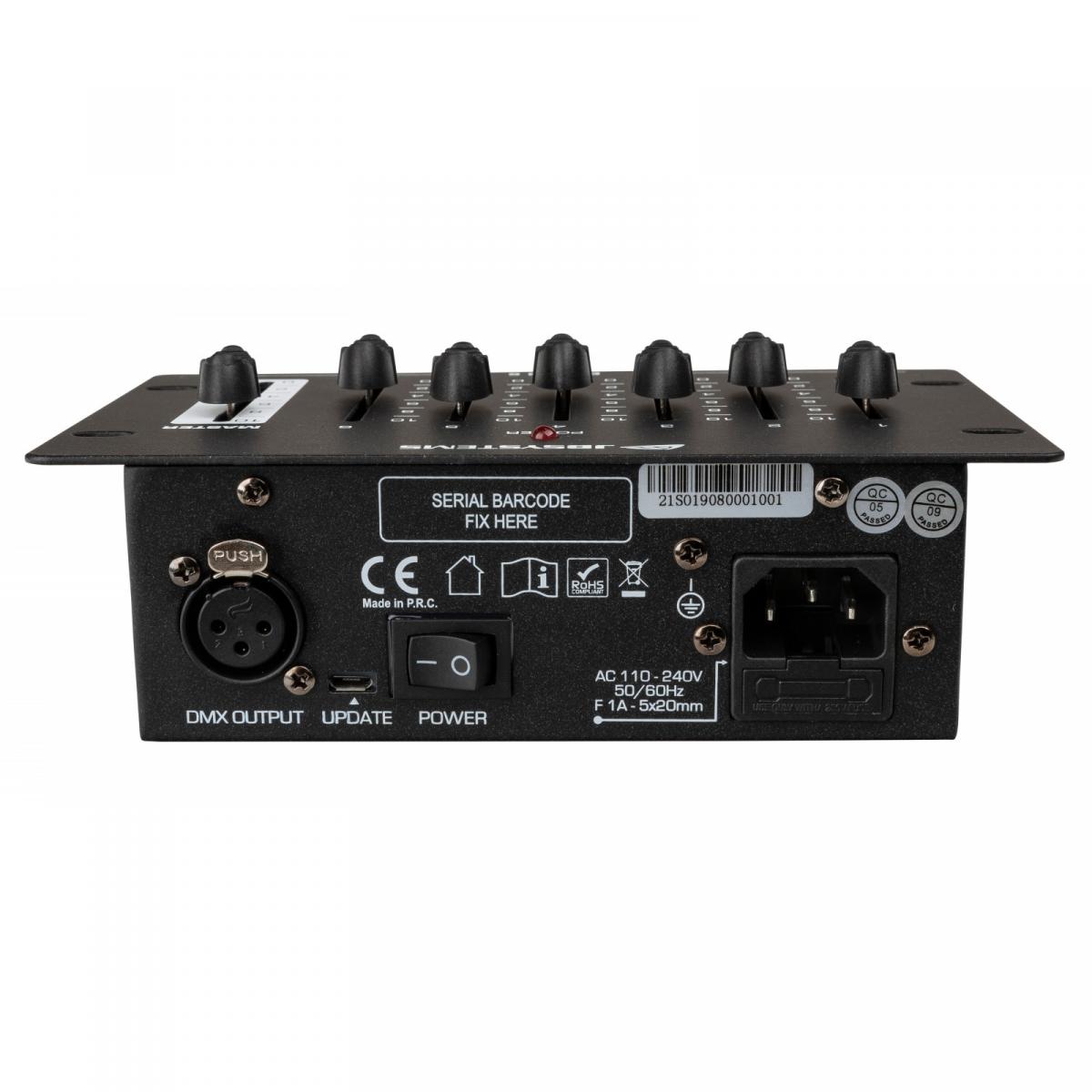 Kompaktes und benutzerfreundliches 6 Kanal DMX Lichtmischpult von JB Systems mit eingebautem Netzteil.