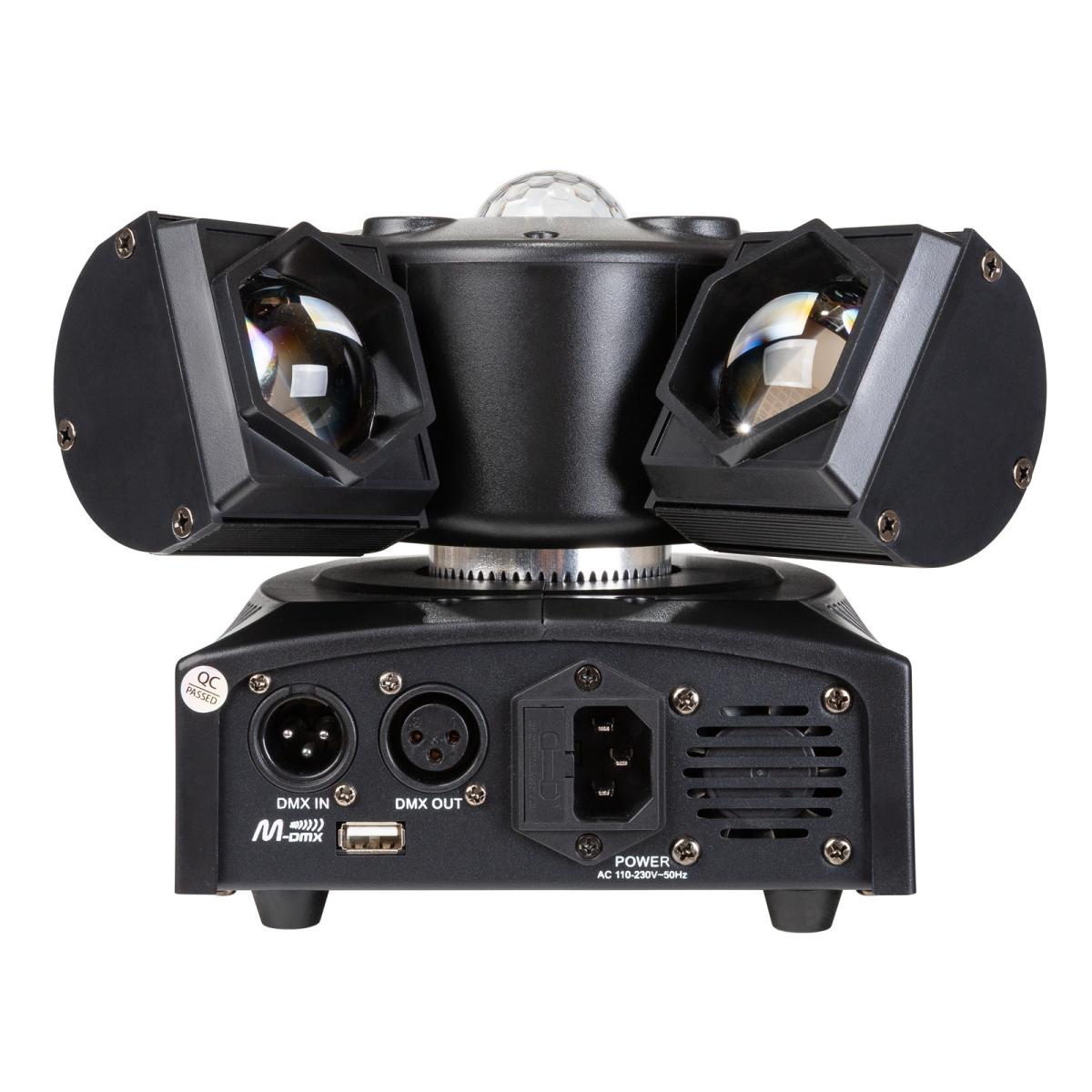 - 4 x 15W RGBW-LEDs in den Armen, eine 10W RGBW LED, 2 x 5W Amber-Strobe LEDs, 1 x 100mW roter Laser und 100mW grüner Laser (Klasse 2M) auf der Oberseite.