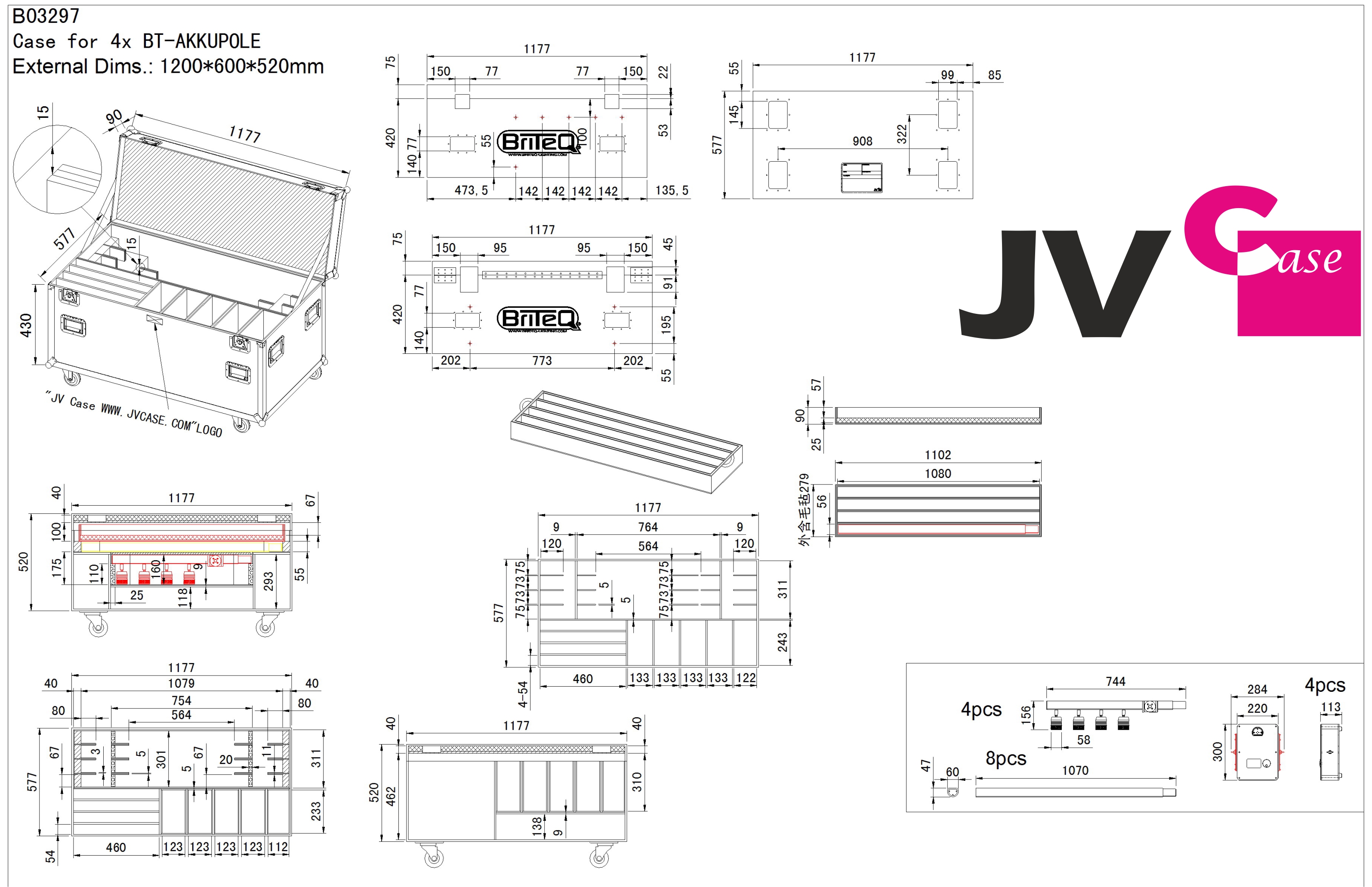 Robustes Flightcase für 4 komplette BT-AKKUPOLE mit Rollen von JV-Case.