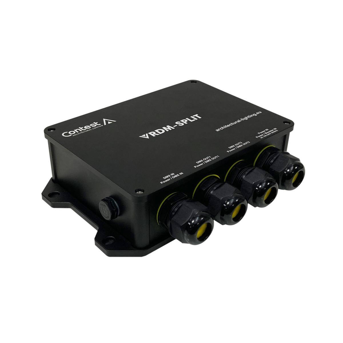 Der VRDM-SPLIT von CONTEST ist ein DMX-RDM-Splitter mit 1 x IN und 2x OUT, IP66. Der Splitter verstärkt das eingehende Signal auf 2 DMX Ausgänge.
