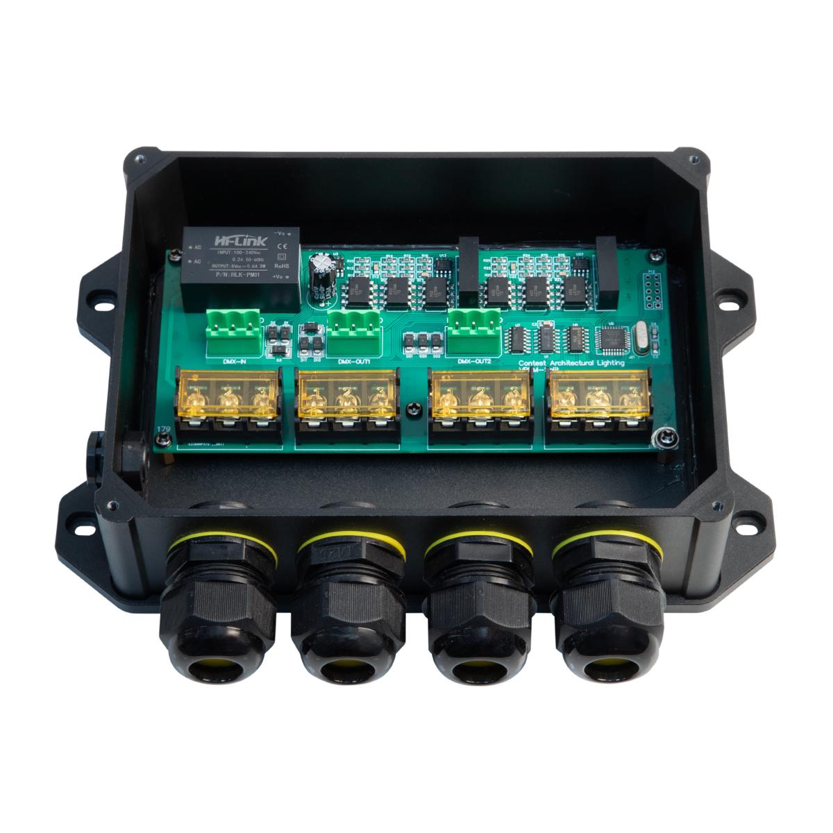 - Zur Verstärkung des eingehenden DMX-Signals auf zwei RDM-kompatible DMX-Ausgänge.