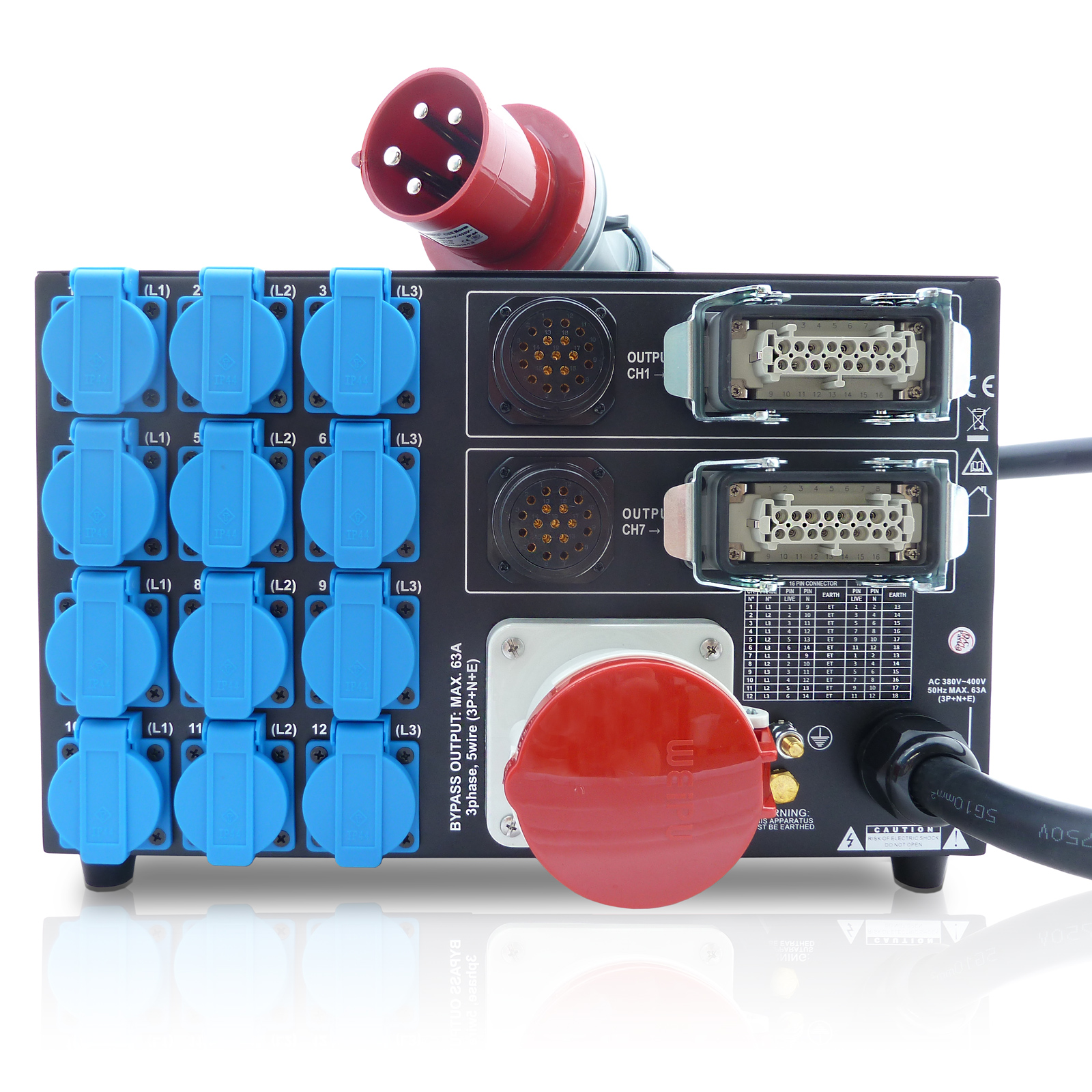 - 12 x Schuko-Ausgangssteckdosen 16A (4 Steckdose pro Phase)