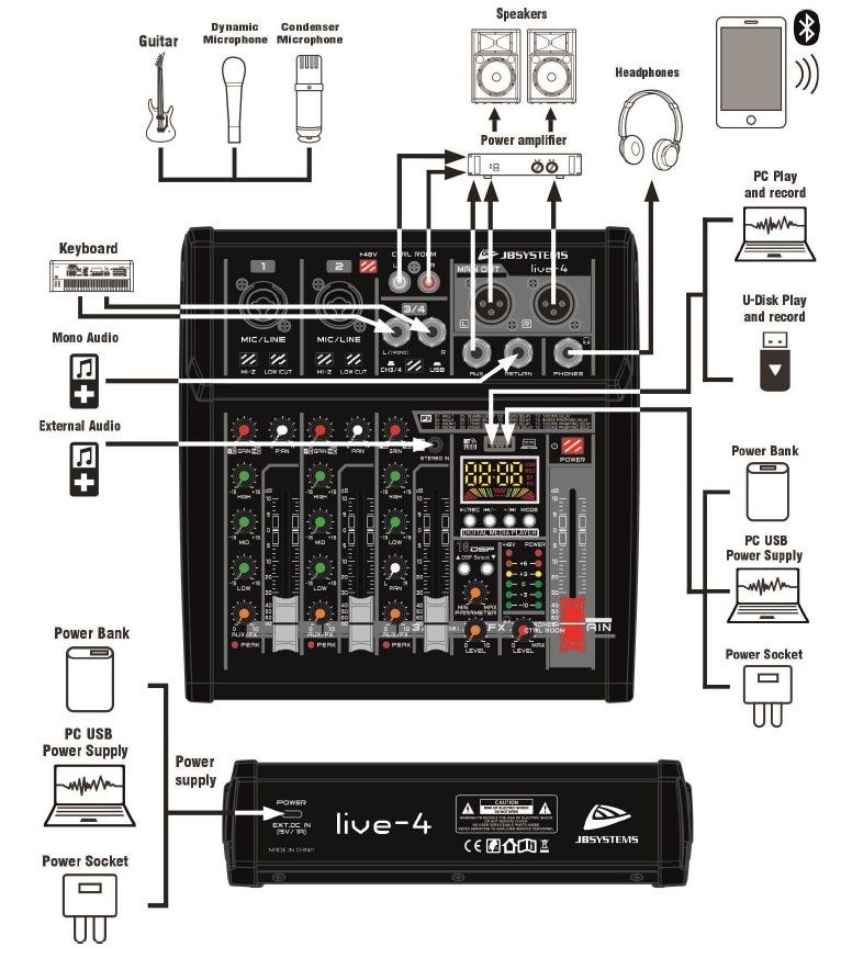 - Kombinieren Sie das Live-4 mit einer Powerbank und batteriebetriebenen Lautsprechern, um 100 % mobil zu sein.