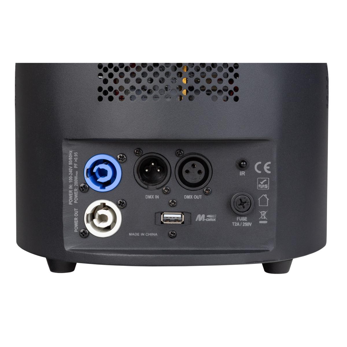 - USB-Anschluss für drahtlose DMX-Steuerung mit einem optionalen Briteq® WTR-DMX-Dongle.