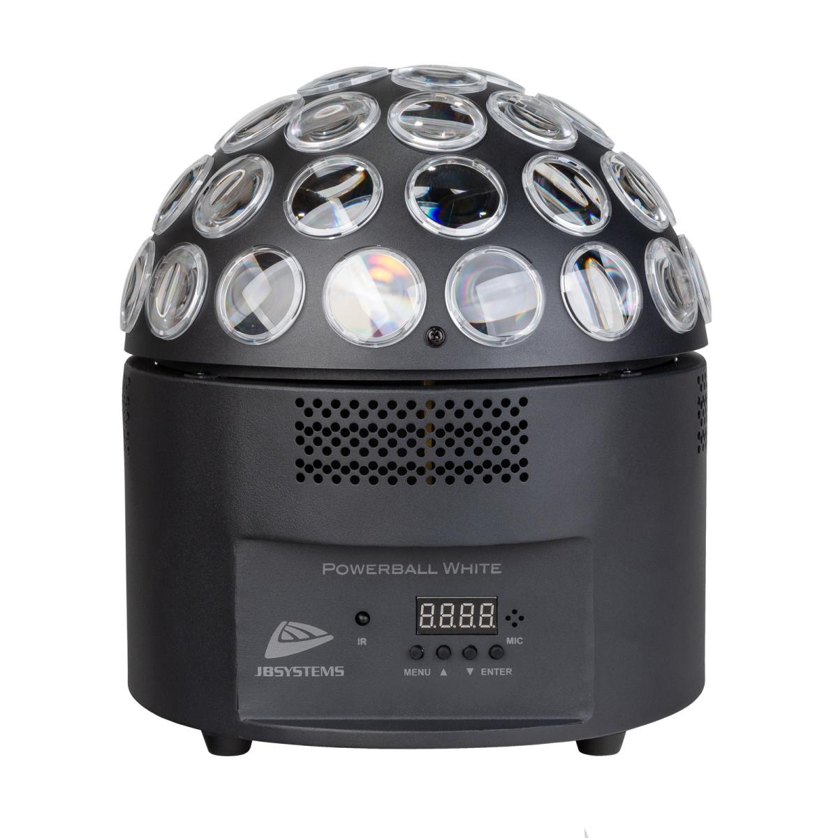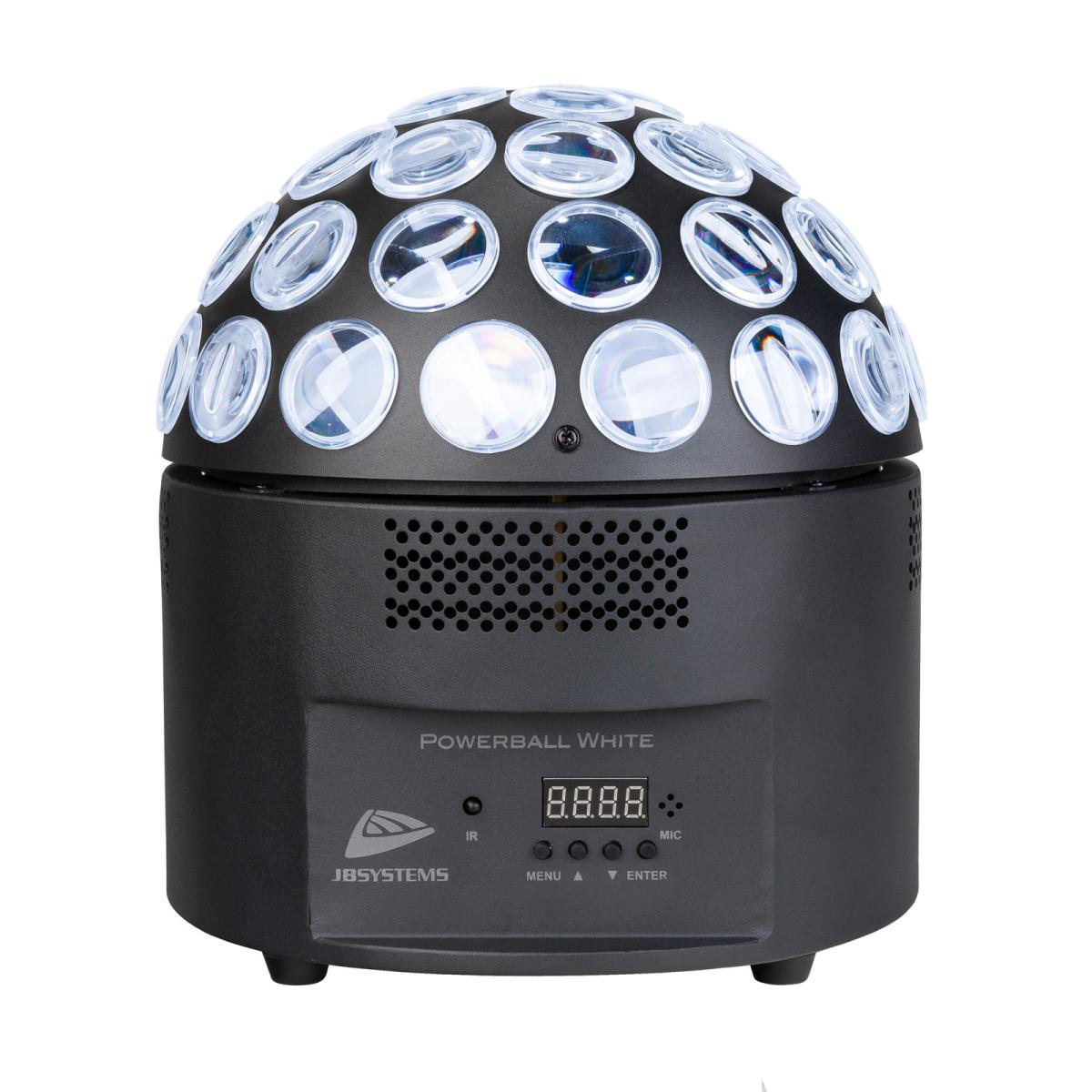 Der JB Systems POWERBALL WHITE ist eine leistungsstarke LED-Alternative zur klassischen Spiegelkugel. Die Halbkugel mit einer LED Leistung von 200 Watt kann über DMX gesteuert werden und projeziert kalt- und warmweiße rotierende Strahlen.